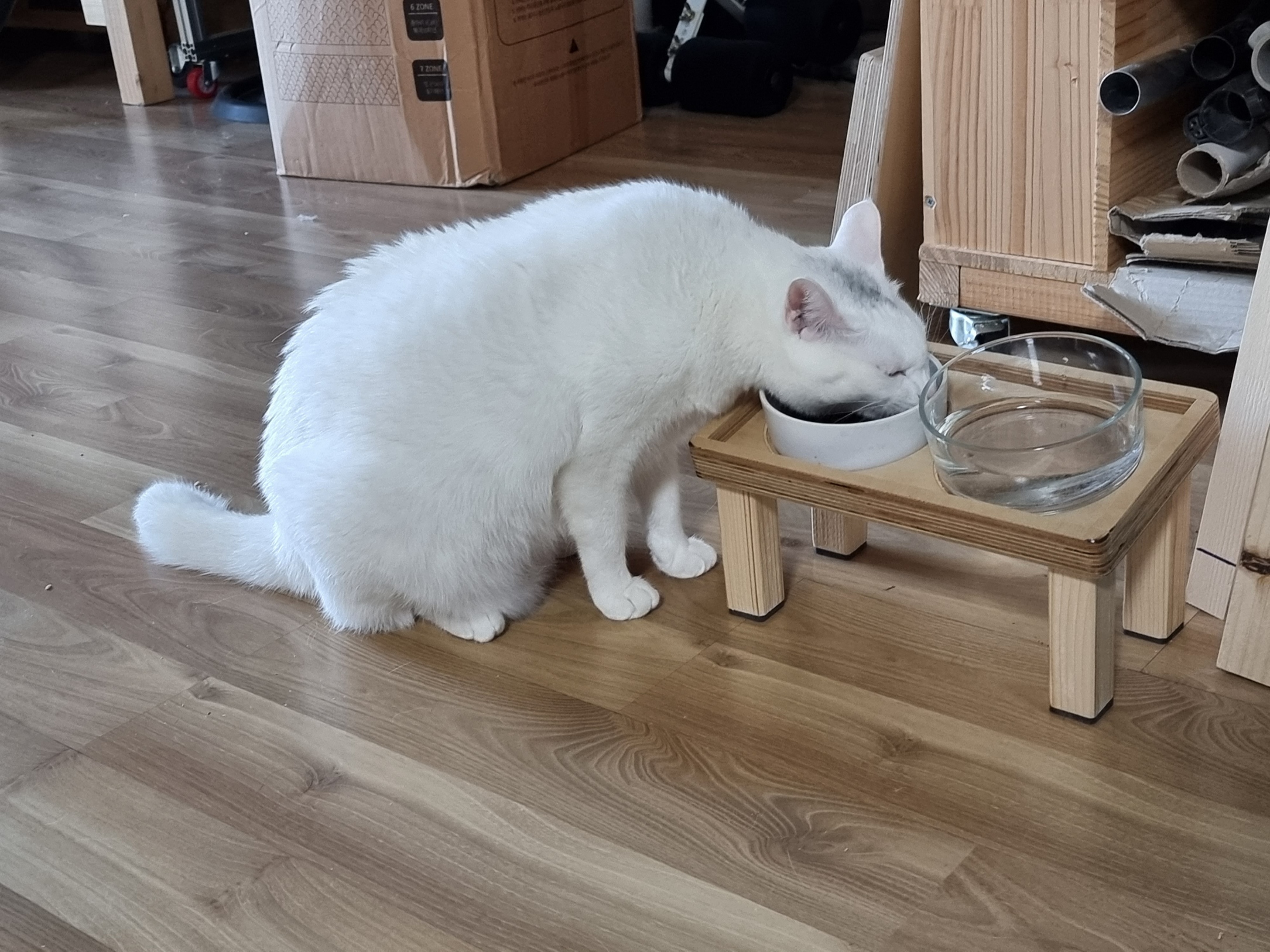 하지만 고양이가 코로 사료를 밀어내면서 핥아서 사료를 먹는 습관때문에 뒷쪽을 높여주면 좋을것같네요.