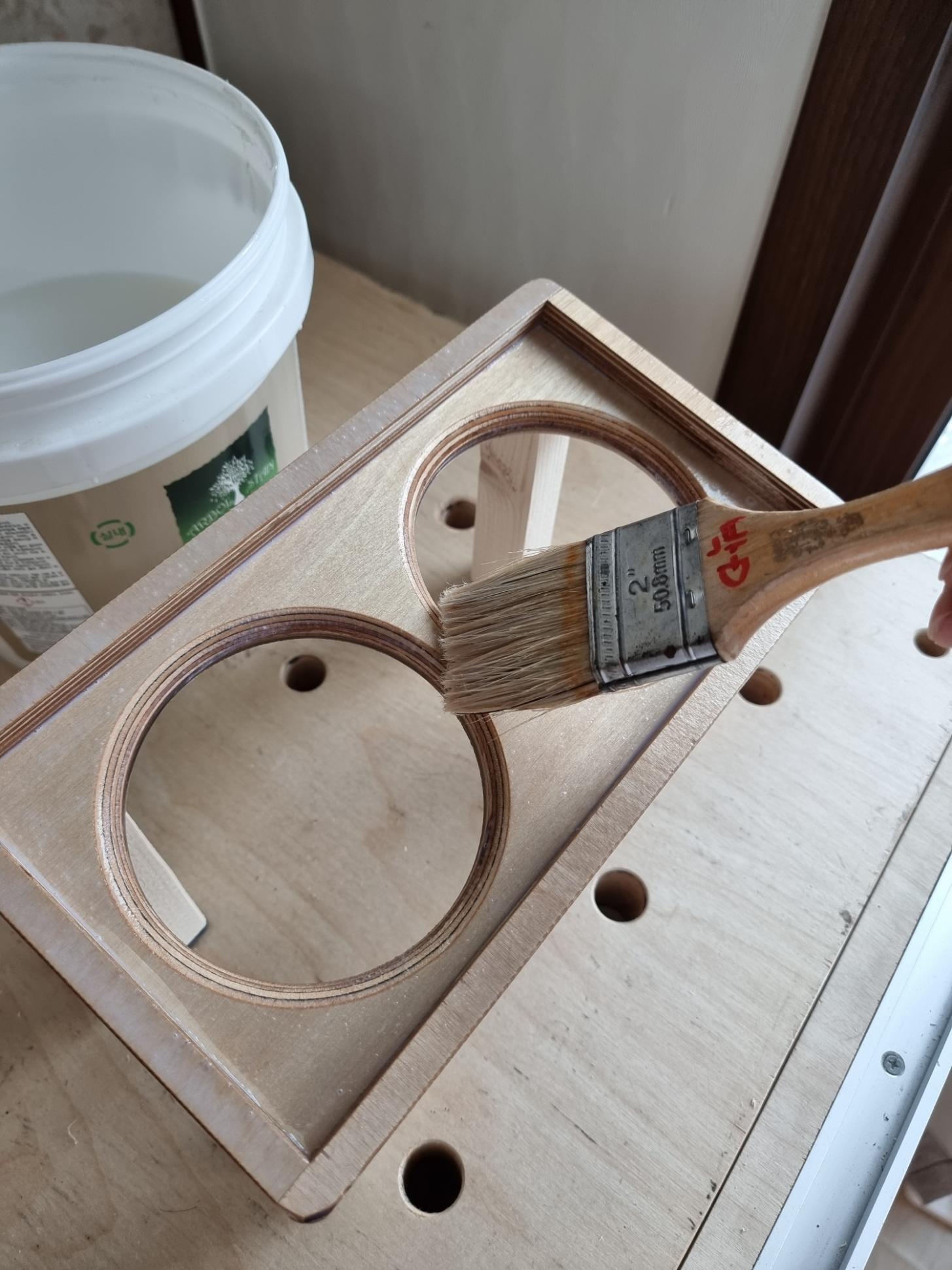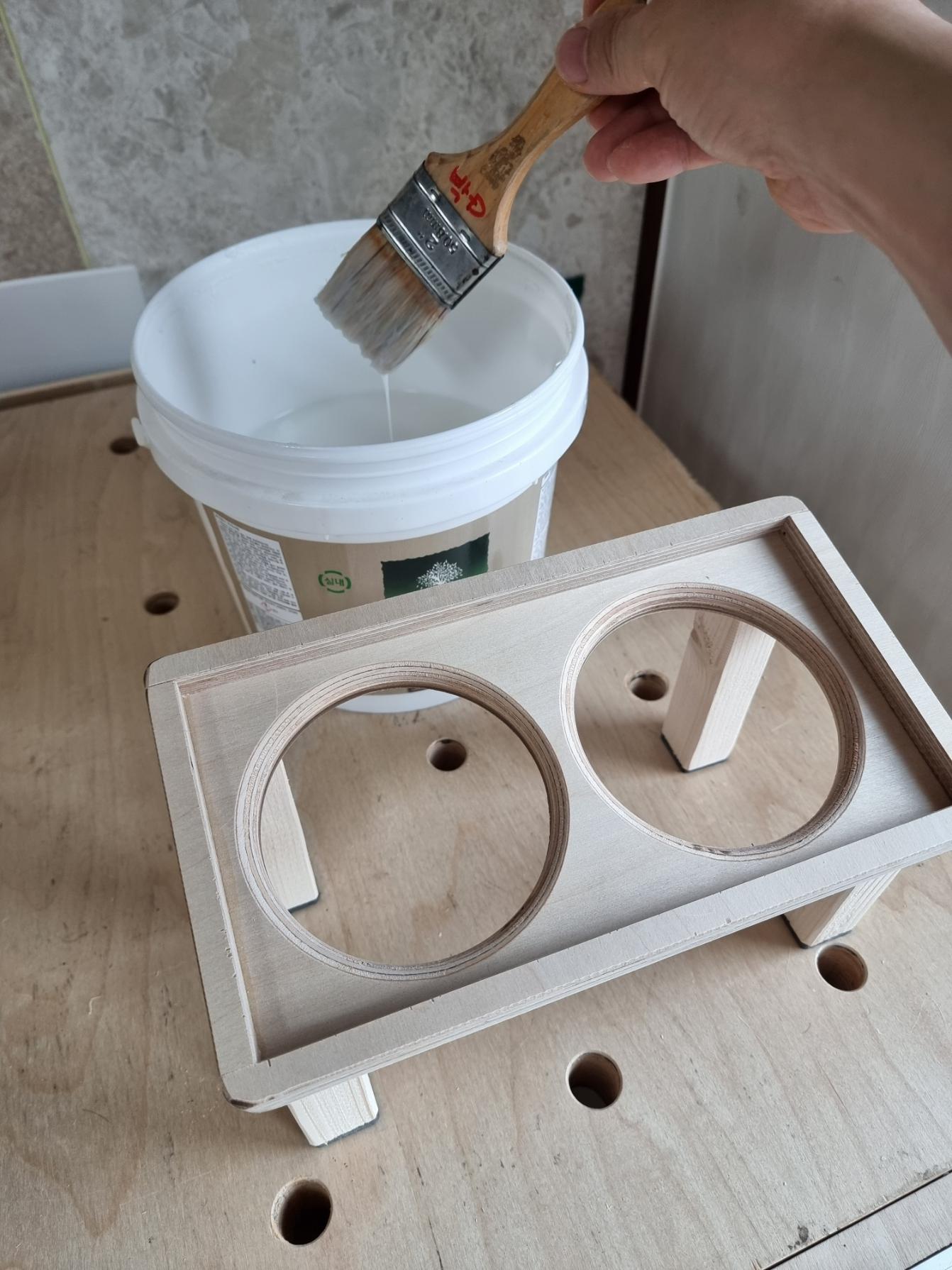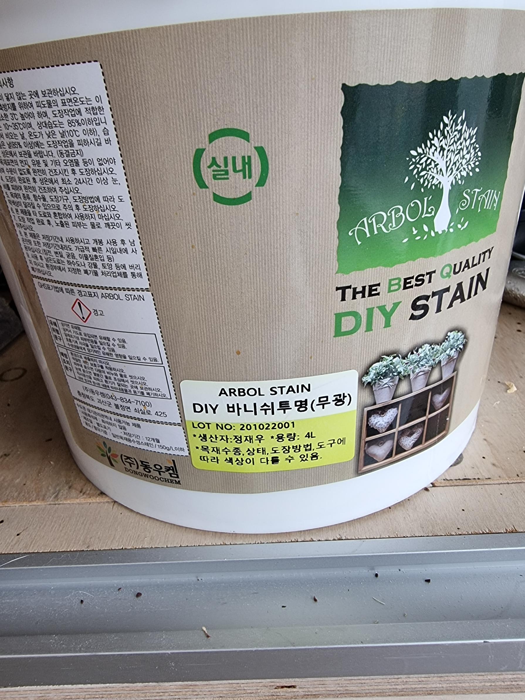 이제 물을 흘렸을 때도 판자에 스며들지 않고 잘 닦이도록 바니쉬를 발라줍니다.