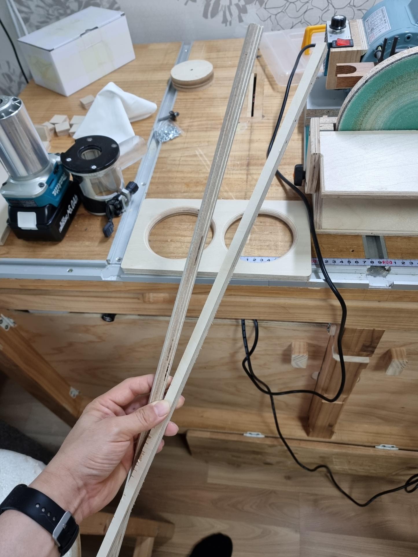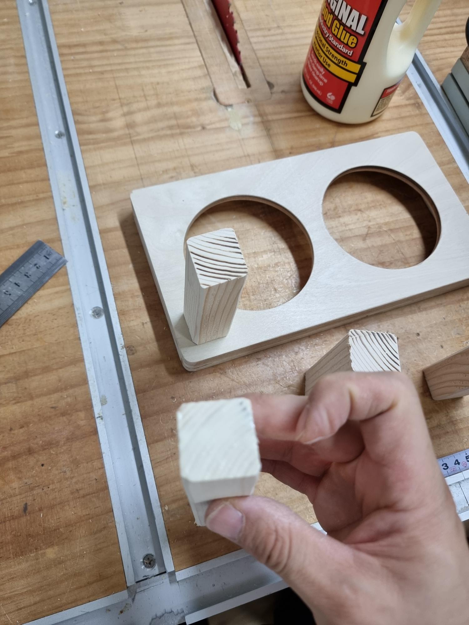 이제 밥그릇이 될 판자를 골라서 밥그릇이 나란히 들어갈 적당한 크기로 잘라주고요